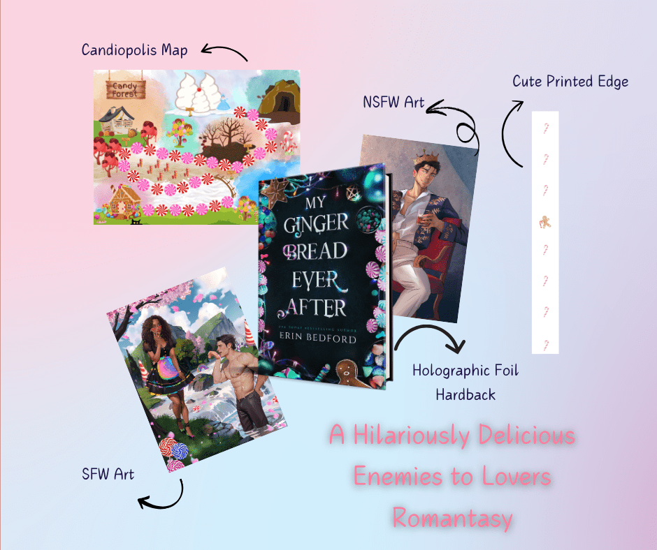 A hilariously delicious enemies to lovers romantasy in a gorgeous hardback with holographic foil, red ribbon bookmark, and map end page with sfw and nsfw art, and cute gingerbread candy cane printed edges.